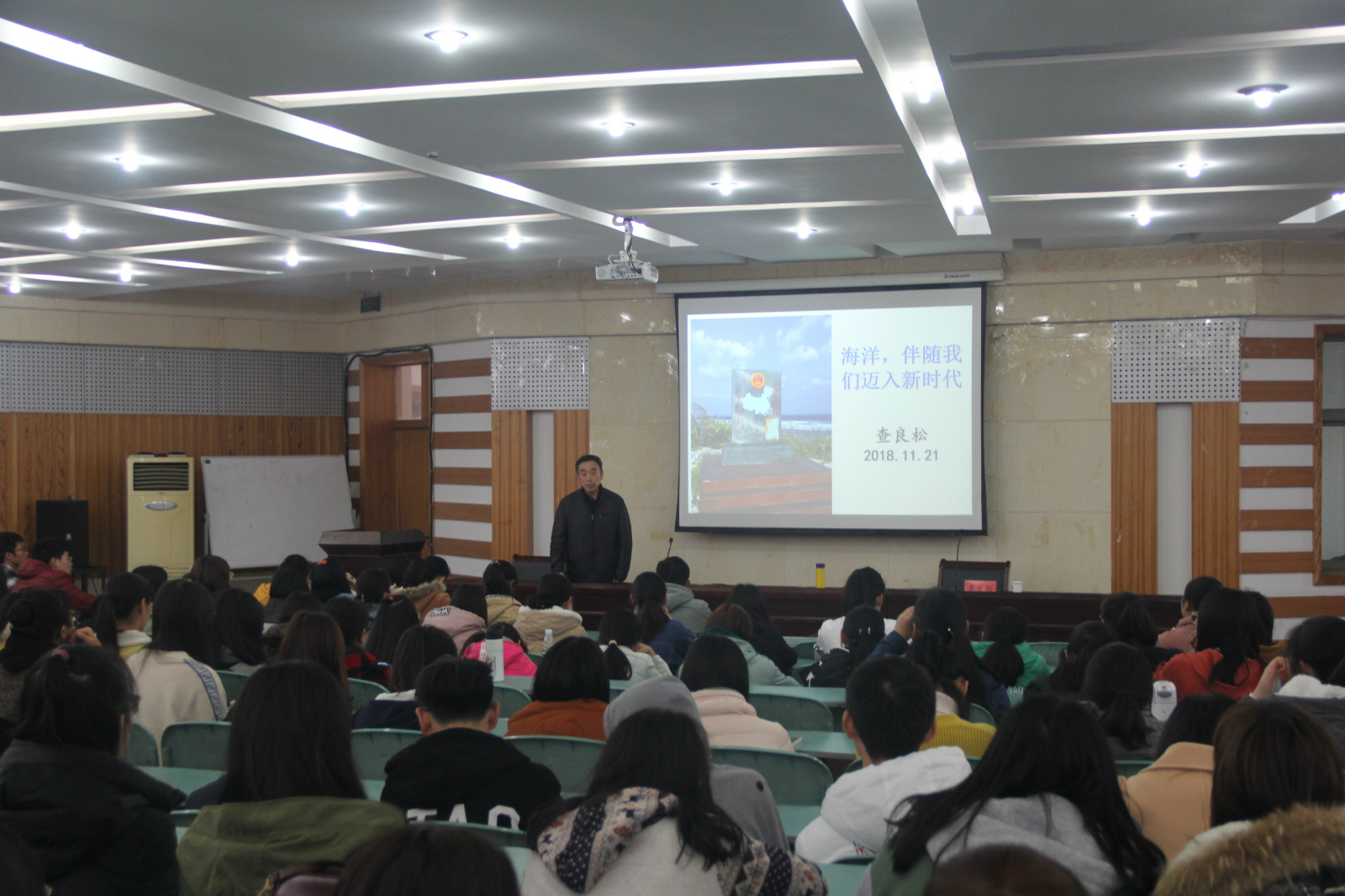 本网讯(地旅学院 尹仟仟/文、刘韵扬/图)学地理能治天下,习规划善谋未来。2018年11月21日下午,地旅学院邀请校关工委查良松教授在财务处二楼报告厅为新生做了题为《海洋,伴随我们迈入新时代》的专题报告。地理学大类、旅游管理、城乡规划三个专业全体新生到场聆听。报告会由新生辅导员侯永康主持。