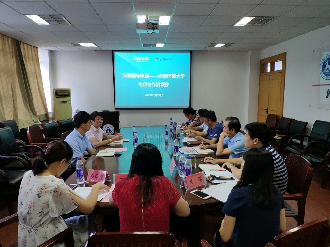 19日下午15:00,“万豪国际集团—安徽师范大学”校企合作洽谈会在地旅学院行政楼四楼会议室召开,地旅学院党委书记贾冠忠、党委副书记乔静、旅游管理专业负责人杨效忠、酒店管理专业负责人尹寿兵及专业实习秘书、专业教师和辅导员代表出席会议。会议由学院党委副书记乔静主持。