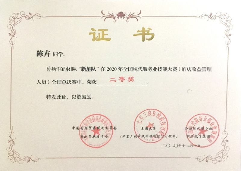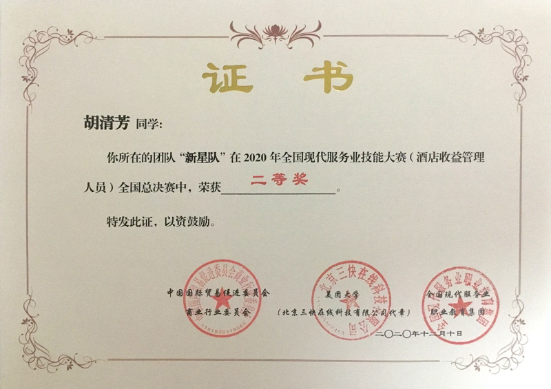 (本网讯 陈卉)2020年12月10日,2020年全国现代服务业技能大赛(酒店收益管理人员)全国总决赛在北京中航资本大厦举办。银河galaxy集团2017级酒店管理专业本科生陈卉、胡清芳代表我校参加比赛。