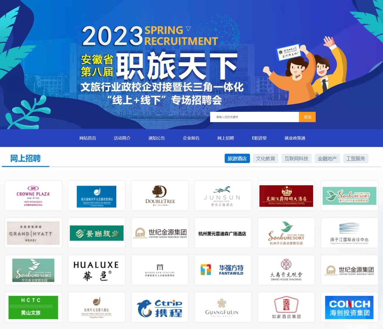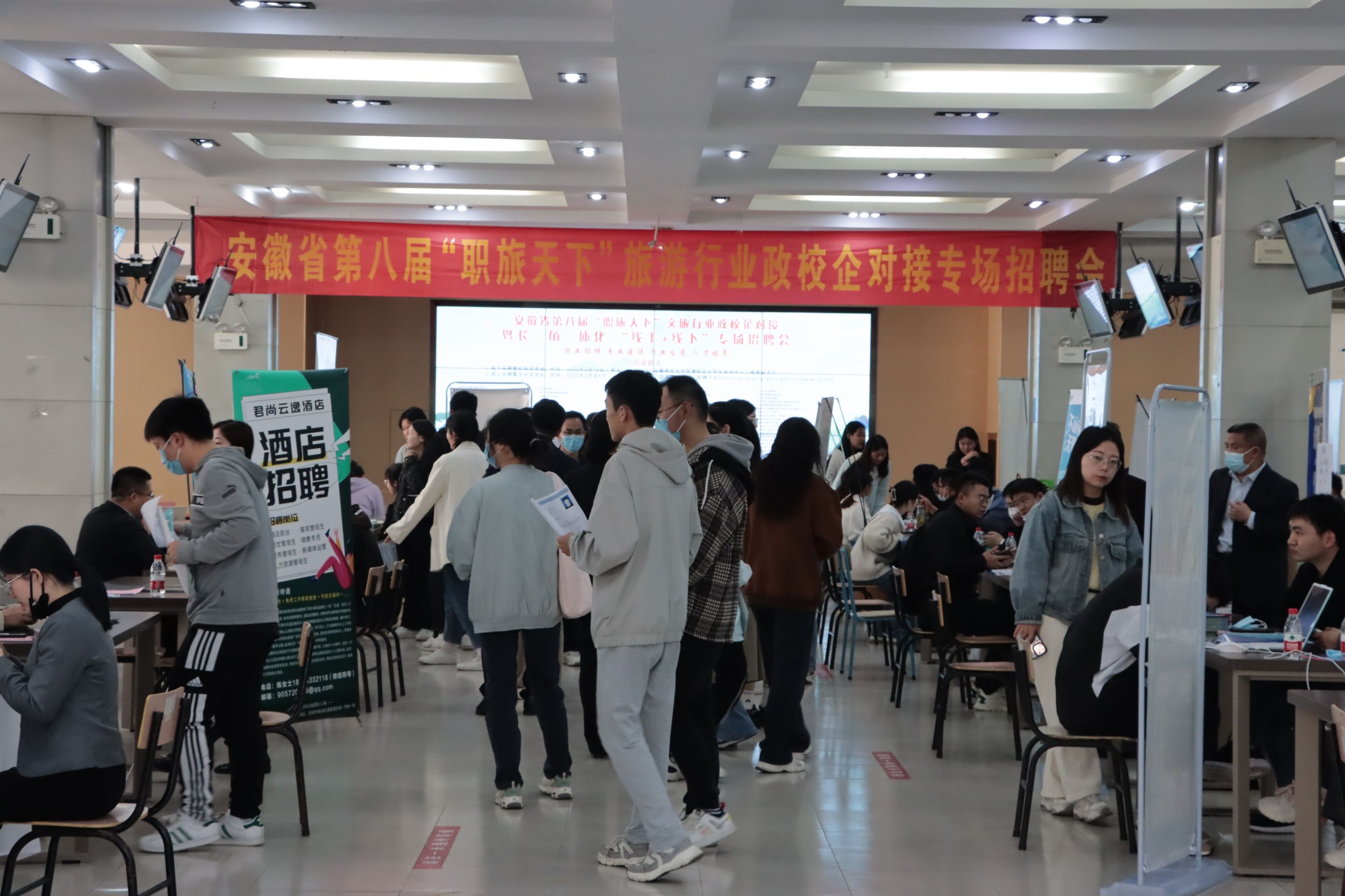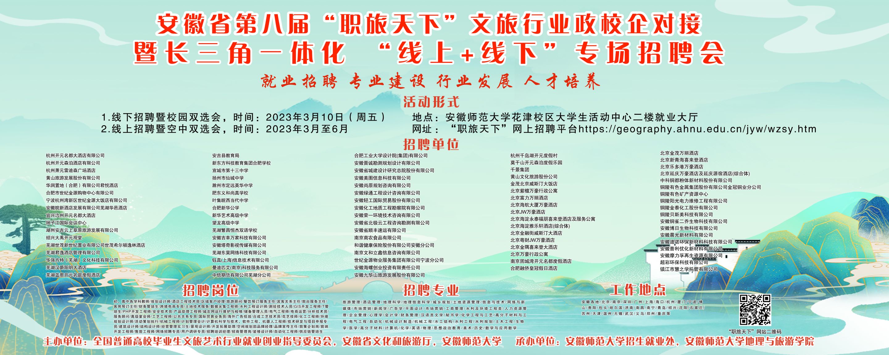 3月10日,由全国普通高校毕业生文旅艺术行业就业创业指导委员会、安徽省文化和旅游厅、安徽师范大学主办,安徽师范大学招生就业处和银河galaxy集团承办的安徽省第八届“职旅天下”文旅行业政校企对接暨长三角一体化“线上+线下”专场招聘会在我校成功举办。来自全国各地的近百家企业和铜陵市义安区前来招聘,提供岗位3000多个,涉及文化、旅游、教育、科技等多个门类,涵盖国内外知名酒店集团、景区、地产、规划、咨询、会展、旅行社、教育机构、互联网科技等多个业态,吸引了全校及周边高校毕业生的到来。