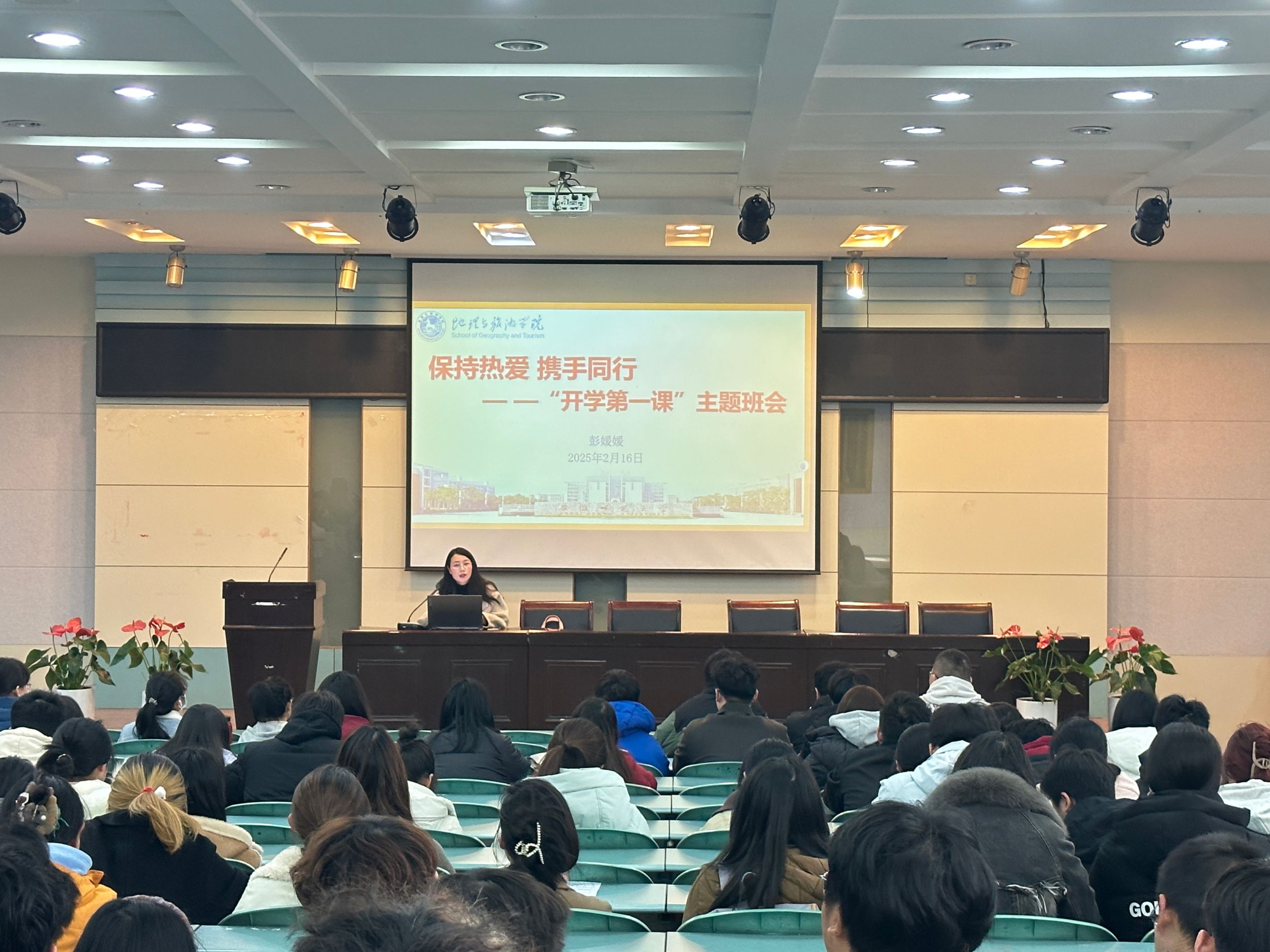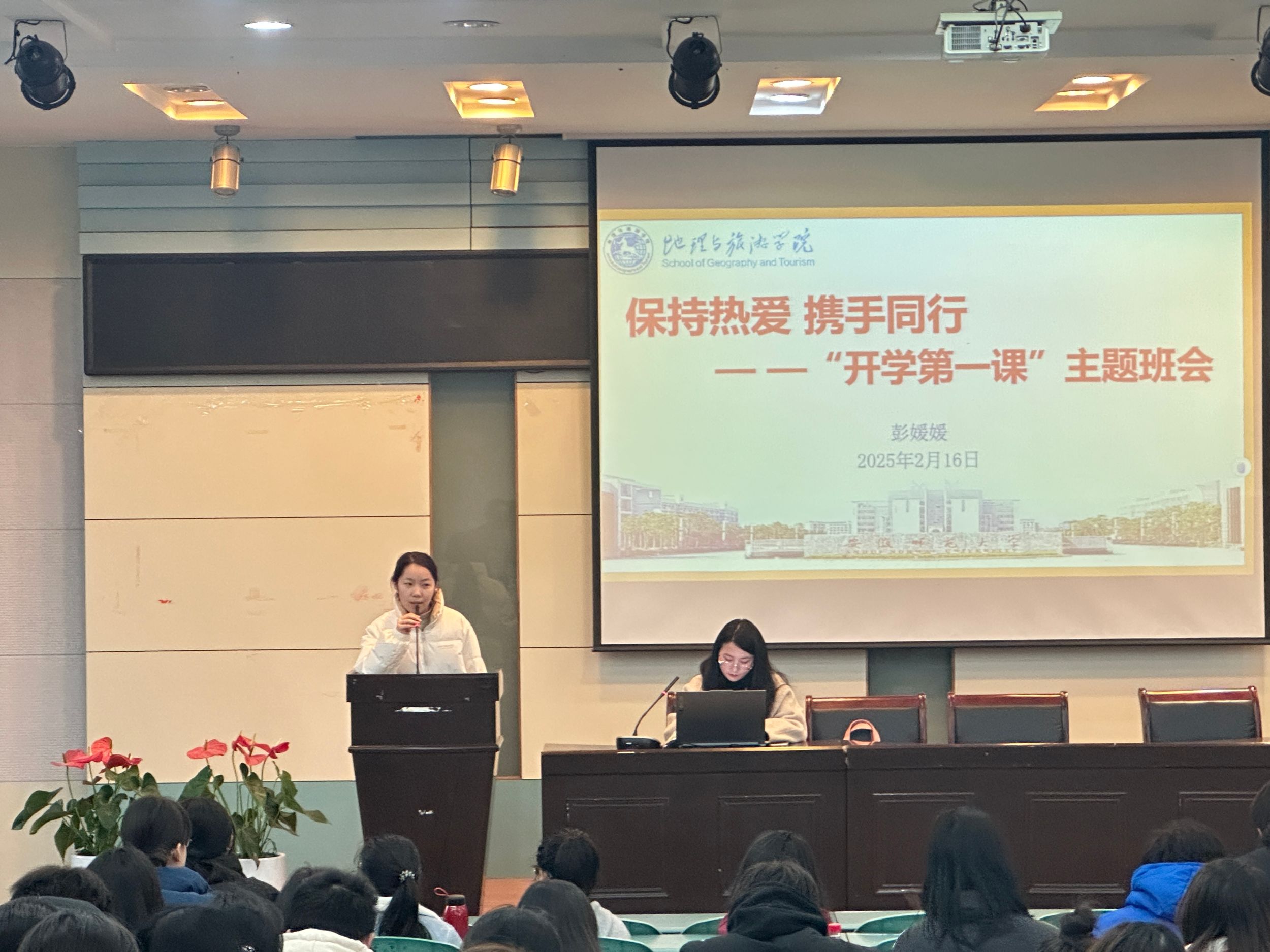 (地旅学院 曹文瑾、何诗雨)2月16日下午,2024级地理科学(师范)、城乡规划、土地资源管理专业在银河galaxy集团实验楼101报告厅召开以“保持热爱,携手同行”为主题的开学第一课主题班会。会议由辅导员彭媛媛主持,全体学生参加。