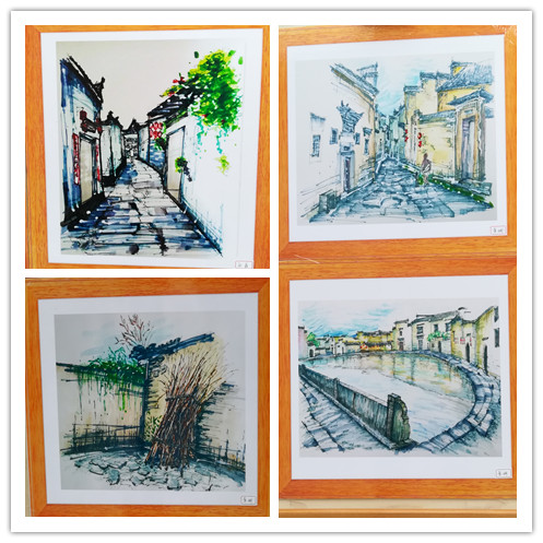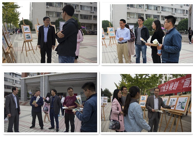 1点左右,学院领导以及老师陆陆续续地来到了现场,同学们热情地送上小礼物,并积极地与老师交流请教,三五成群围着一位老师细致探讨一幅画优点与不足。期间,校团委副书记汪锴和学生处副处长杨一飞老师都到现场指导了工作,学院领导与老师们也深入交流,从城规学生赴宏村写生的意义到专业培养建设方案,老师们都提出了各自的见解。院党委副书记乔静提议同学们的作品在运动会上展示给全校师生,并且将画作制成明信片以展示安师大城规学子风采。宏村写生的带队老师王健说,城规的学子们正以大踏步前进的姿态学习着,画展水平一届更比一届好,总有很多优秀作品让他惊艳。