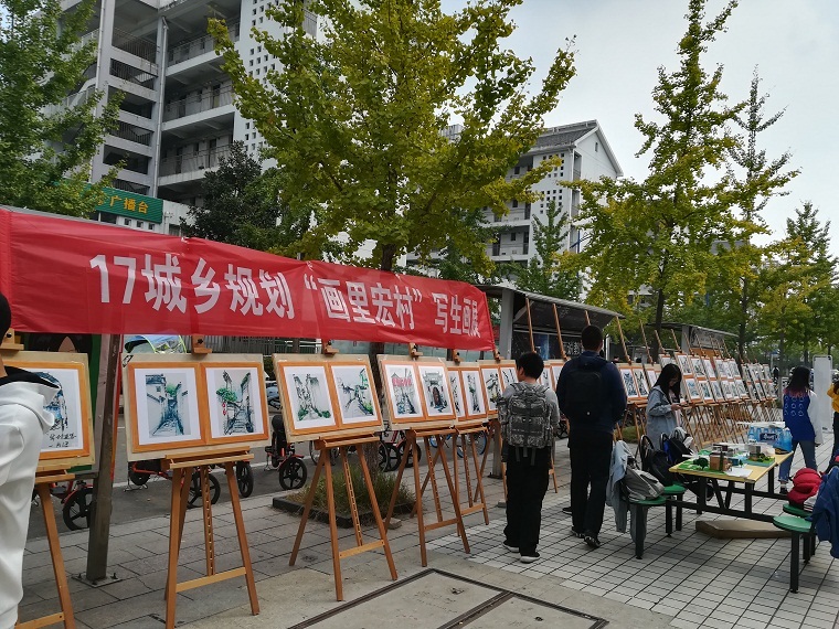 为此次画展的顺利开展,17级城乡规划的学生们早在10多天前开始准备,打印作品,拼装画架,筹集画板,邀约领导老师,等等。在上完第4节课后,城规的同学们全员参与到画展的现场布置工作中,现将画架搬到二食堂,拉横幅,摆放作品。画展很快吸引了众多学生的目光,同学们积极为他们讲解作品,或浓墨重彩,或清雅婉约,以不同的笔触思考记录了宏村美景。