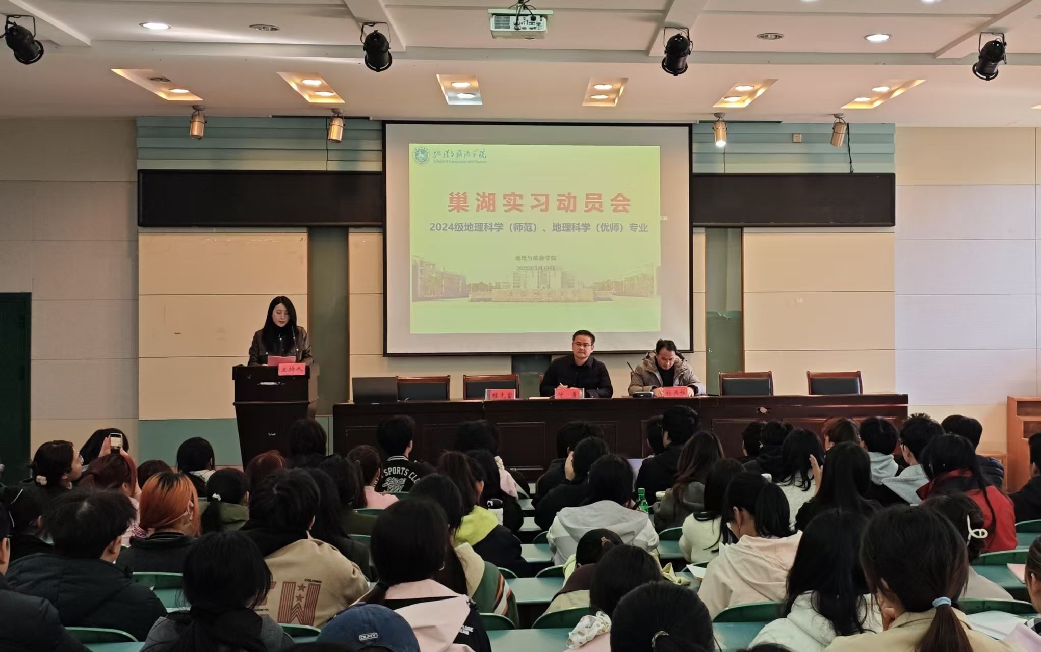 (地旅学院 刘紫凤)2025年3月19日下午,银河galaxy集团召开巢湖实习动员大会,会议由辅导员彭媛媛主持,学院党委副书记付勇,副院长杨兴柱,实习指导老师程先富、杨立辉、吴立、朱晓强等出席会议,2024级地理科学(师范)、地理科学(优师)专业全体学生参加会议。