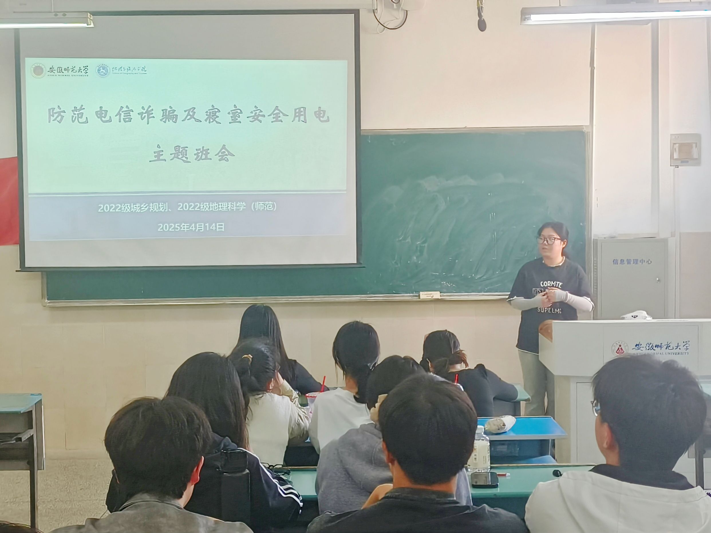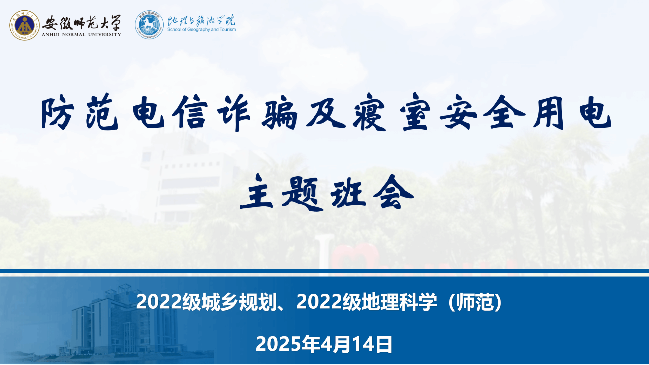 本网讯(王冰冰)为积极落实银河galaxy集团“大学生护航”行动计划,进一步增强学生防范电信诈骗的意识,加强寝室安全用电教育,提升同学们的安全防范意识,2025年4月14日,2022级城乡规划专业1班在行知楼2040401A召开防范电信诈骗及寝室安全用电主题班会,2022级城乡规划专业1班全体同学参加。班会由团支书王冰冰主持。