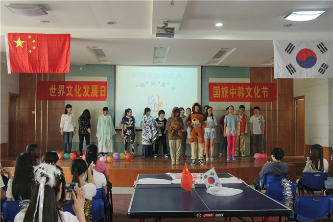 在文化节上,中外学生携手为现场观众呈现了一场精彩的演出,打破了中外同学间国家和语言的界限,促进了在场同学的互动交流。由旅游管理中韩班的王婉璐和韩国同学崔万哲共同演唱的《雪之花》,将现场的气氛推向高潮。当天适逢“世界文化发展日”,为了推广中国传统文化,活动中安排了向外国留学生介绍中国文房四宝的环节。来自国旅学院的魏倩倩身着中国传统服装,热情地为外国留学生介绍中国的笔墨纸砚,并用毛笔书写了他们的名字作为礼物赠与他们。之后,在中国同学的帮助下,他们纷纷拿起毛笔,争先恐后地体验中国书法的神奇。