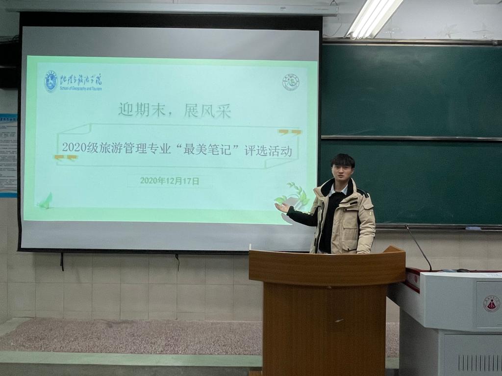 本网讯(地旅学院 邹瑾璇 吴思慧)“笔”墨生香,独家“记”忆。迎期末,展风采,为营造良好的期末备考氛围,为即将到来的期末考试做准备,建设班级学风,展现班级风采。12月17日晚, 2020级旅游管理班委会在4号教学楼203教室组织开展“2020级旅游管理专业第一届最美笔记”评选活动。此次活动由二班学习委员张乃豪主持,在2020级旅游管理专业全体班委的精心组织和全体同学的积极参与下圆满完成。