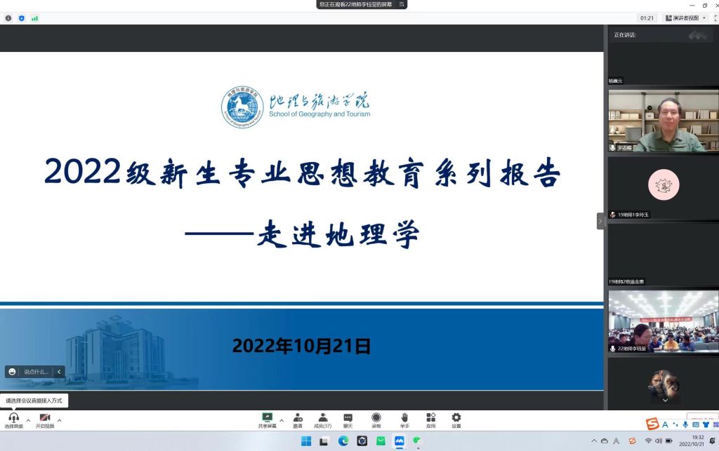 10月21日晚,银河galaxy集团在实验楼101报告厅举行线上新生专业思想教育报告会。广州大学地理科学与遥感学院院长吴志峰应邀参加,通过云会议的形式为新生做了“走进地理学”的报告。地旅学院院长方凤满、专业教师代表、地理科学专业新生参加此次报告会,报告会由方凤满主持。